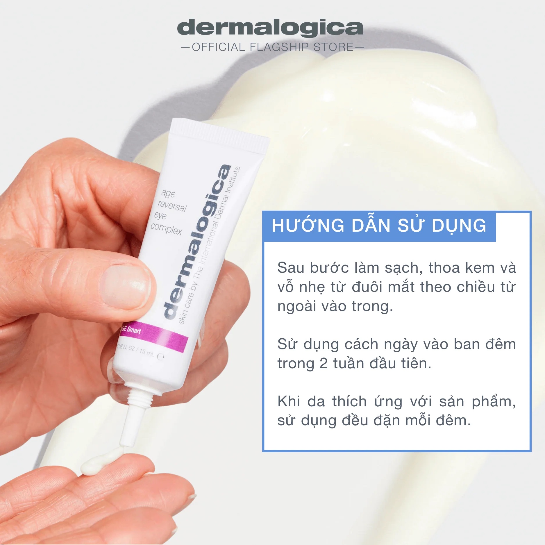 Cách sử dụngSử dụng cách ngày vào ban đêm cho 2 tuần đầu tiên. Khi da thích ứng được với sản phẩm, sử dụng mỗi đêm. Sau bước làm sạch, thoa và vỗ nhẹ, bắt đầu từ đuôi mắt, từ ngoài vào trong. Sản phẩm chỉ sử dụng ban đêm.